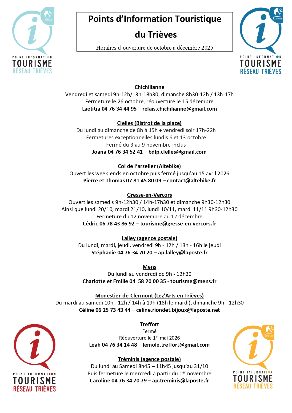 Retrouvez ci-dessous les horaires des points information touristiques du Trièves.